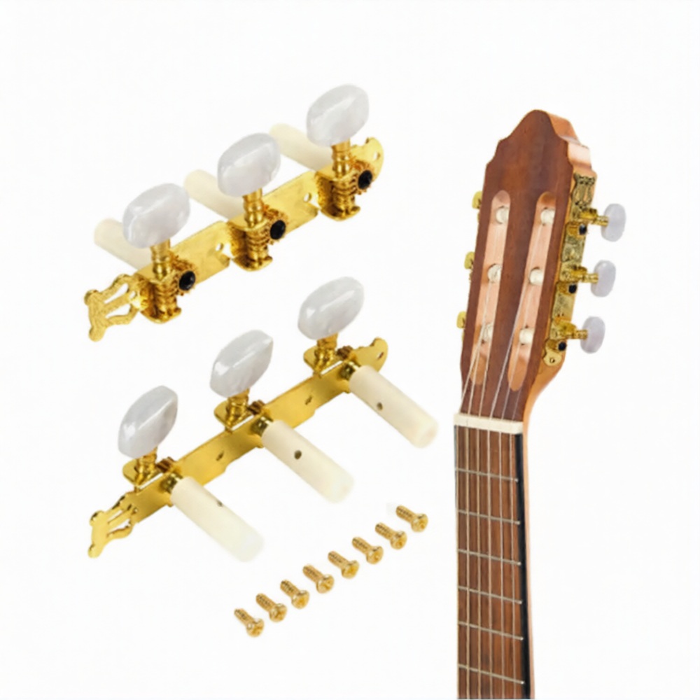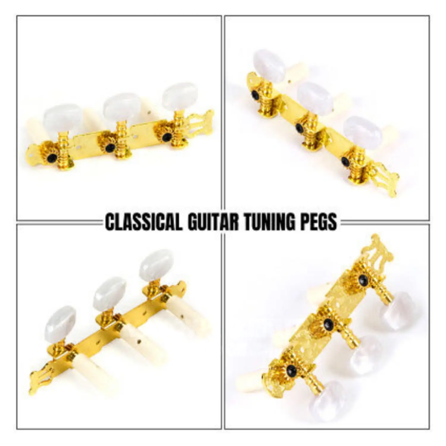 A replacement pair of 3-in-line tuning machines for classical guitars. These pegs feature traditional white buttons and a gear ratio designed for precise nylon string tuning. Easy to install on most standard classical guitars.