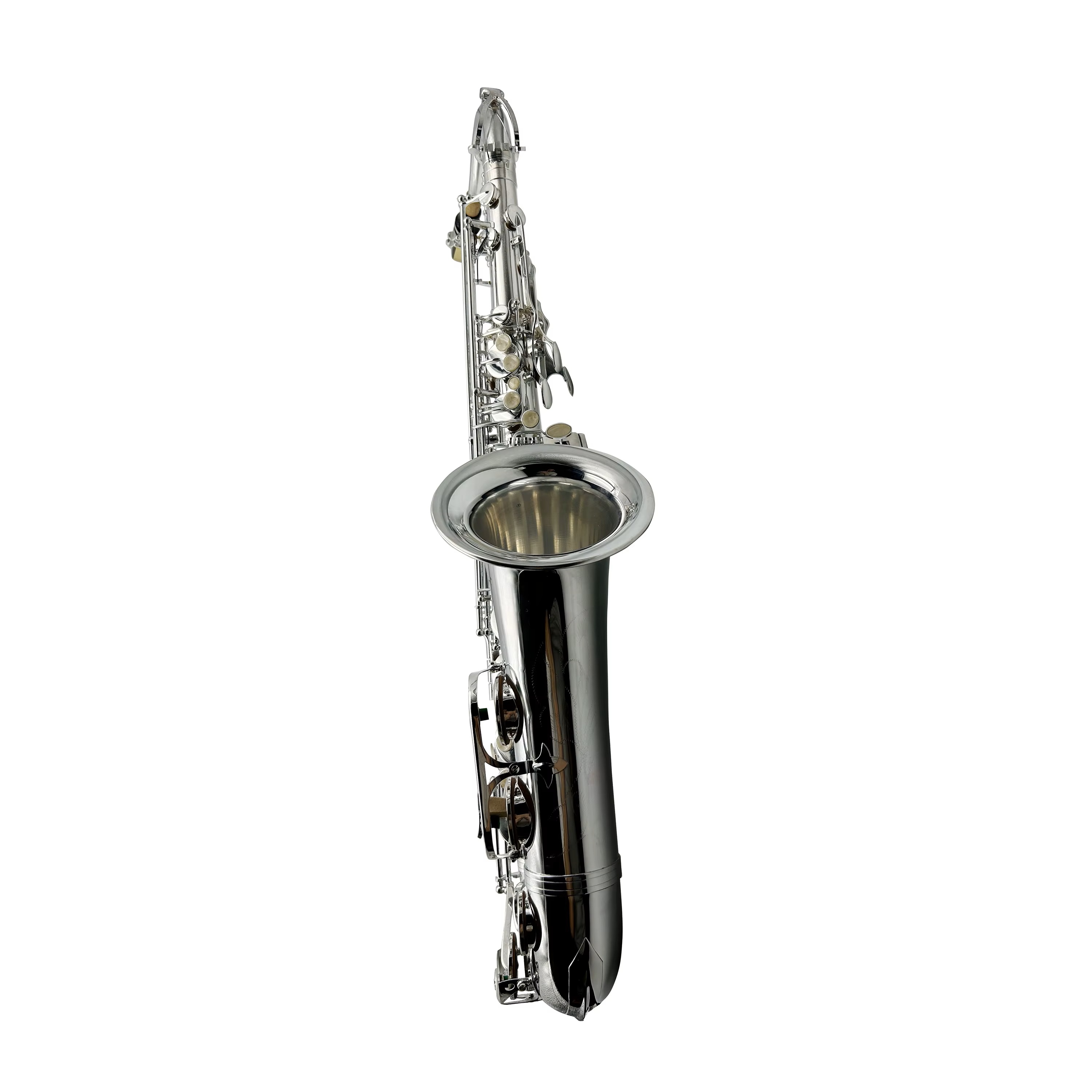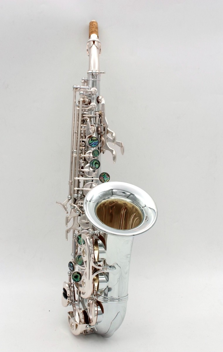 A curved soprano saxophone with a elegant silver-plated finish, providing a bright and piercing sound suitable for various genres. Its curved design allows for easier microphone placement and handling. A high-quality instrument for discerning musicians.