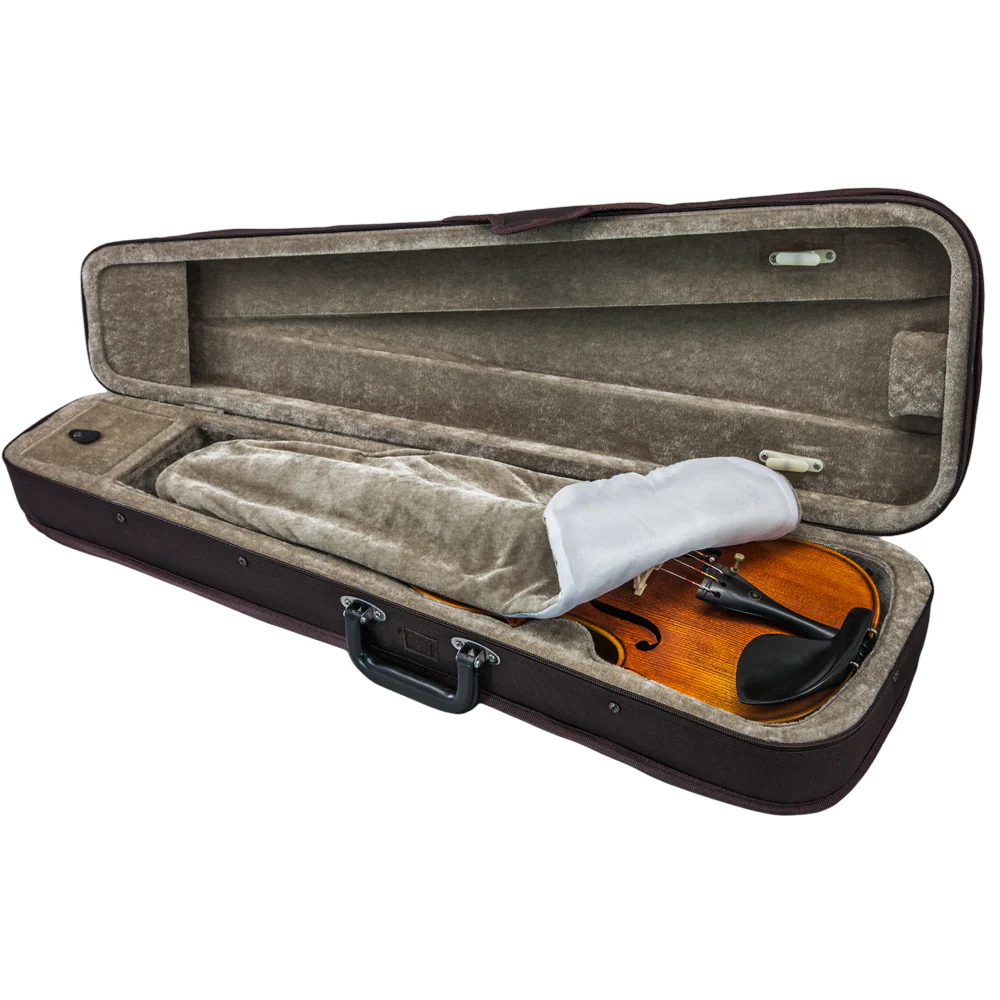 A student-grade violin outfit featuring a lightweight triangular carrying case (WCS). It is designed to provide a reliable instrument and everything needed for a student's first music lessons. Offers a clear and resonant tone.